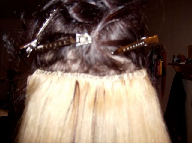 Ok SO - 2 rows of micros (the ones I'm testing for Sherrie) 2 rows of my make-shift sew-ins (1 double weft, 1 single weft) 3 rows of single weft LG (cos I got damn tired of sewing stuff in!!)