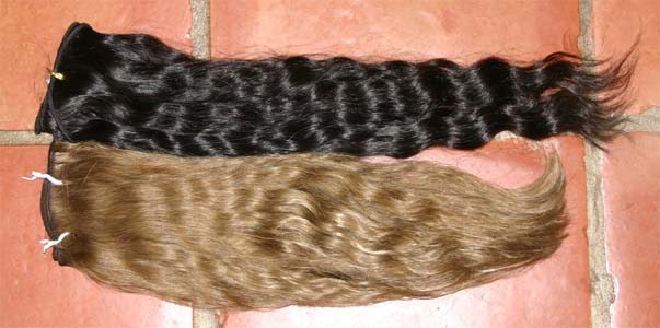 I deep conditioned after I finished, for 10 minutes, with heat...it feels decently soft, but not as nice as the virgin hair (which makes sense)...I only did 2 oz. of the 4 oz. that I got...I protaced it to my hair, am cutting it down a bit...these pics are from when it was longer, and so its thin at the ends...the other pic is the dry hair next to the black, I cut off about 2 in. because the ends were noticeably dry...and at that point, the ends seemed pretty nice...I'm cutting off another about 2 in. anyways, so that it matches with thickness in my hair...
