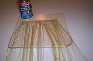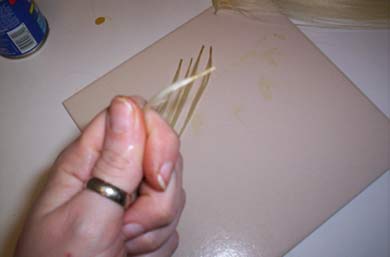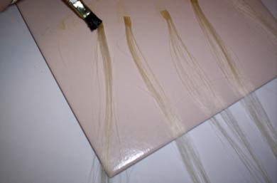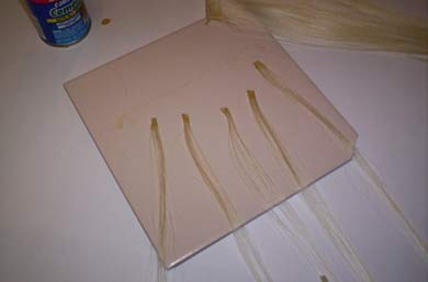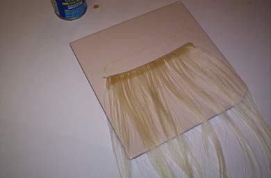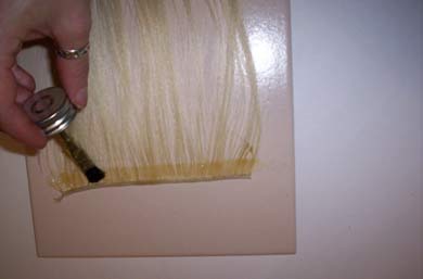 This is a strip of thermofiber, but it works on human hair too. Maybe even better because real hair is porous. I just laid out the hair and then brushed the glue on thick enough to penetrate through to the tile underneath, but not so there was globs of it floating around. Had to hold the hair taut with my other hand, but couldn't show that and take a picture at the same time!