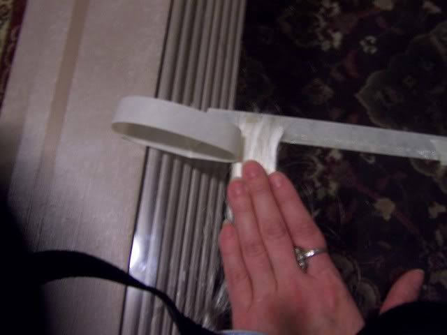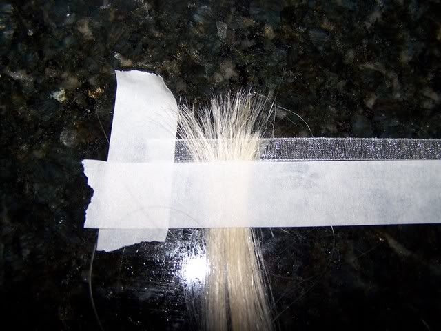 Oh and if it helps think sandwich, (tape on bottom not necessary if glass), tape down ribbon, tape hair over ribbon,  hair going above ribbon smoothing out hair, top layer of tape lines up with bottom of ribbon ( line of hot glue slightly above the masking tape.  Pull another piece of ribbon over the top, lining up with bottom ribbon.  Pull to the right & rub into hair & ribbon in a \ motion to the right with a shishkabob stick.