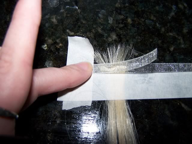 Pull tape over & secure, line it up with the bottom of the ribbon, you can move the hair a bit to distribute.