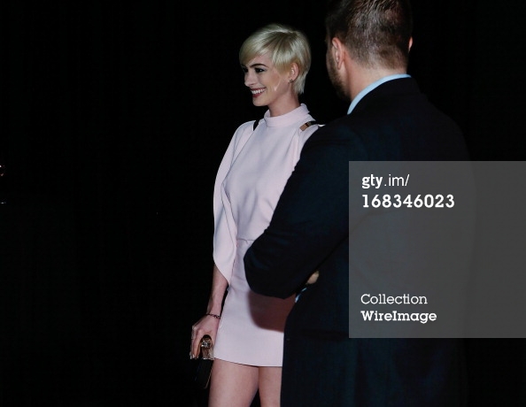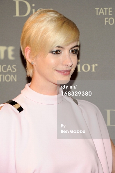 Quick change and styling for after show party; wow! Would never have thought it; Anne Hathaway short and blonde. Clearly keeping the short do as well and as often happens after the initial big change she is enjoying trying different looks.