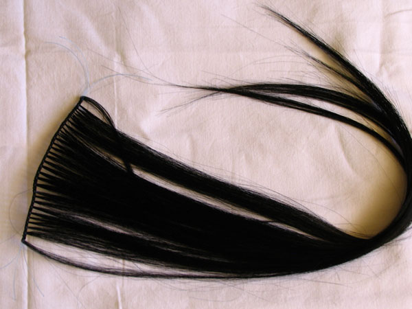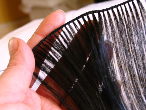Another thing that might be interesting to know is that the hair I'm weaving with is 22" and the finished length of the weft is between 20" and 21" with a beard of somewhere around 1". The little bit of hair that is in the actual weft is a very short length so the length of the finished weft will really depend on what length you leave the beard more than anything else. It's alot easier to work with the weaving with a longer beard, but gradually as I've been experimenting I've left it shorter and shorter as I work it so now it's down to about 1". Before I got the hang of it I let the beards be longer, like maybe 2" or even 3" and then just cut them shorter but now I'ms tarting to get greedy about the hair and try to leave the beard as short as possible as I go instead. ;)