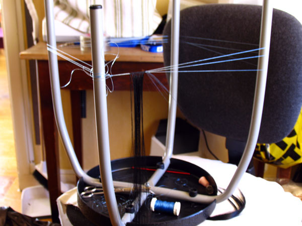 I do not own a weaving pole and I didn't feel that I want to buy one either because I'm not interested in doing this proffesionally so... Can you say DYI? An up-side-down stool worked just fine ;) But I think I'm going to borrow my fathers tool shed and make a couple of weaving poles anyway because quite frankly, it was alot of fun weaving the hair and I was very impressed with the low "shedding level" of the finished thing, but next time I won't be usign fishing line ;)