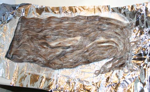 Here is the hair after I slopped the bleach on it and put it in the foil...this time, it is only 30 vol developer...so it should go slower...hopefully harm the hair less...