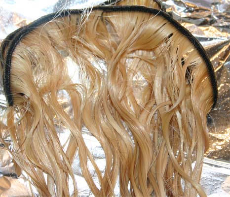After washing (next time I'll probably also condition, seems a bit dry)...this is before I dried the hair, so its still wet...a few things, first, stupid black thread at the weft, darn!...second, seems a bit more red than I was hoping, next time, I'm gonna need to go for maybe 90 minutes for perfect yellow...